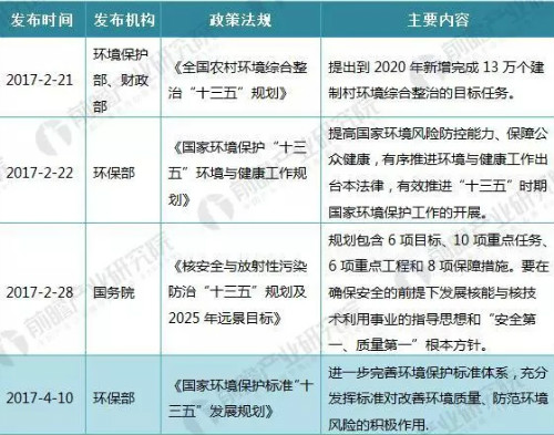 至2017年4月10日,環(huán)保部發(fā)布《國(guó)家環(huán)境保護(hù)標(biāo)準(zhǔn)“十三五”發(fā)展規(guī)劃》,進(jìn)一步完善環(huán)境保護(hù)標(biāo)準(zhǔn)體系,充分發(fā)揮標(biāo)準(zhǔn)對(duì)改善環(huán)境質(zhì)量、防范環(huán)境風(fēng)險(xiǎn)的積極作用。國(guó)家層面政策推進(jìn)為各部門(mén)對(duì)環(huán)境保護(hù)的重視和相關(guān)機(jī)構(gòu)的政策落實(shí)明確了方向,制定了政策約束。