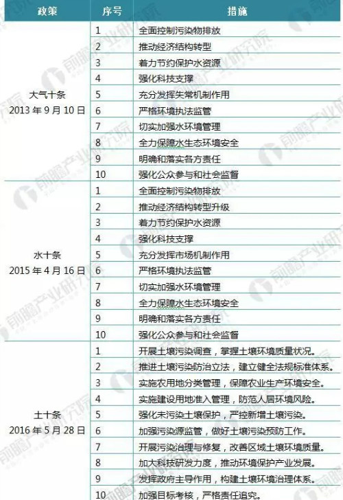 2013年以來(lái),針對(duì)國(guó)家經(jīng)濟(jì)發(fā)展和工業(yè)化及制造業(yè)發(fā)展帶來(lái)的大氣污染、水污染和土地污染問(wèn)題,國(guó)家相關(guān)部門(mén)陸續(xù)頒布的大氣十條、水十條和土十條等政策,有效的為細(xì)分領(lǐng)域的污染問(wèn)題提供了處置措施,有效的加強(qiáng)了國(guó)家環(huán)境保護(hù)的政策落實(shí),及國(guó)家環(huán)境友好型社會(huì)的建設(shè)。