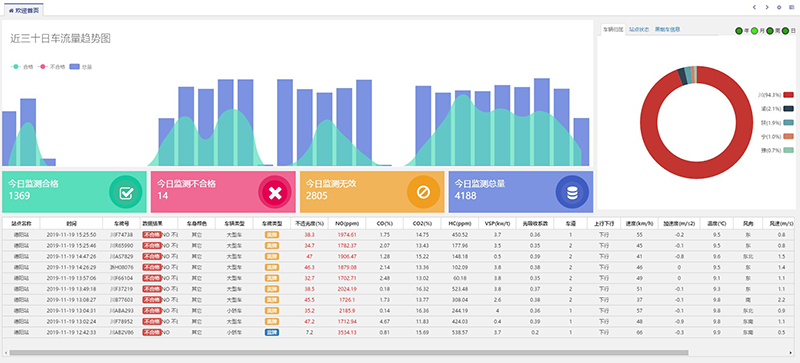 尾氣遙感檢測平臺實現(xiàn)了對機動車尾氣數(shù)據(jù)的采集、管理維護功能??梢詫崟r查詢固定式站點監(jiān)測數(shù)據(jù)及移動式站點監(jiān)測數(shù)據(jù)。所監(jiān)測的數(shù)據(jù)信息涵蓋了機動車尾氣檢測參數(shù)值、氣象參數(shù)數(shù)據(jù)、環(huán)境空氣質(zhì)量數(shù)據(jù)、黑煙車數(shù)據(jù)等。同時結(jié)合環(huán)境空氣質(zhì)量數(shù)據(jù)與尾氣檢測數(shù)據(jù)進行統(tǒng)計分析,并與交管局、車管所進行數(shù)據(jù)庫對接。形成了實時查詢和匹配車輛基本信息于一體的數(shù)據(jù)檢測、統(tǒng)計、分析系統(tǒng)。