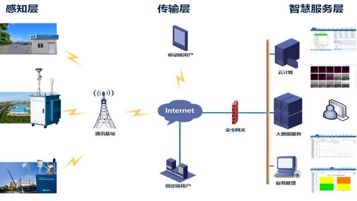 以自動化監(jiān)測儀器為數(shù)據(jù)監(jiān)測、存儲、上傳的載體,通過在環(huán)保主管部門建設數(shù)據(jù)中心、部署軟件應用系統(tǒng),利用已建或新建網(wǎng)絡,各職責部門可通過手機、電腦終端等方式應用監(jiān)測數(shù)據(jù),從而實現(xiàn)對環(huán)境空氣質量的采集、分析、應用和決策。