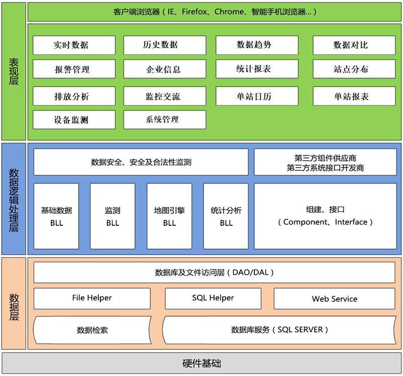平臺的主要功能模塊包括:實時數(shù)據(jù)、歷史數(shù)據(jù)、數(shù)據(jù)趨勢、數(shù)據(jù)質量、站點分布、統(tǒng)計報表、單站報表、數(shù)據(jù)通比、單站日歷、排放分析、報警管理、企業(yè)信息、監(jiān)控交流和系統(tǒng)管理等。