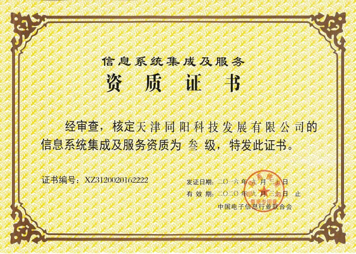 天津同陽科技獲得叁級信息系統(tǒng)集成及服務(wù)資質(zhì)證書 更新時間:2016-10-12 點(diǎn)擊:23997 所屬欄目:公司新聞 Update Time:2016-10-12 Hits:23997 Belong Column:News 天津同陽科技發(fā)展有限公司獲得叁級信息系統(tǒng)集成及服務(wù)資質(zhì)認(rèn)證。
