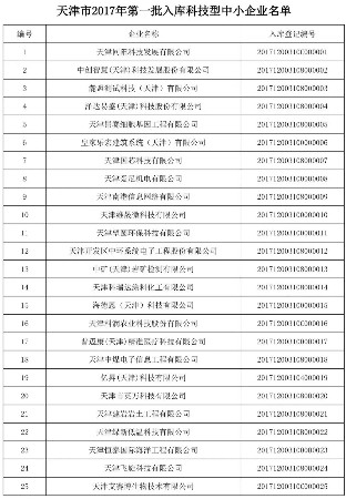 天津市2017年第一批入庫(kù)國(guó)家科技型中小企業(yè)名單公告
