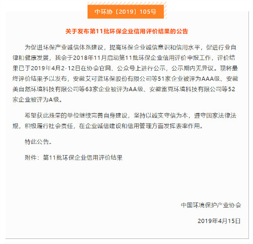 更新時間: 點擊:16478 所屬欄目:公司新聞 Update Time: Hits:16478 Belong Column:News近日,中國環(huán)境保護產(chǎn)業(yè)協(xié)會公示了“第11批中國環(huán)境保護產(chǎn)業(yè)行業(yè)企業(yè)信用等級評價結果”,天津同陽科技發(fā)展有限公司榮獲中國環(huán)保企業(yè)“AAA級信用企業(yè)”稱號。