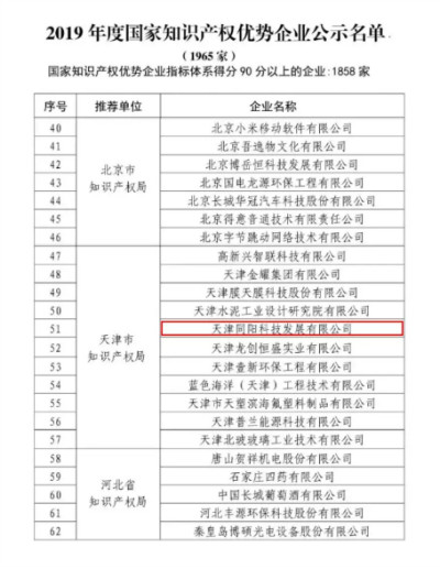 同陽科技入選“2019年度國家知識產(chǎn)權(quán)優(yōu)勢企業(yè)公示名單”